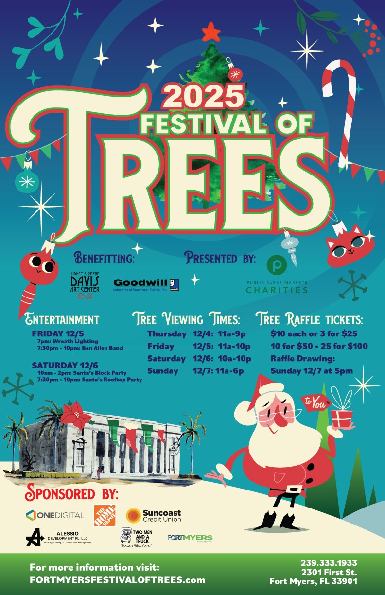 The 19th Annual Festival of Trees returns to the Sidney & Berne Davis Art Center! Experience the beautiful trees decorated by local businesses to raise money for Goodwill of Southwest Florida and SBDAC. See these gorgeous creations for just $2 per person, beginning on December 4th!